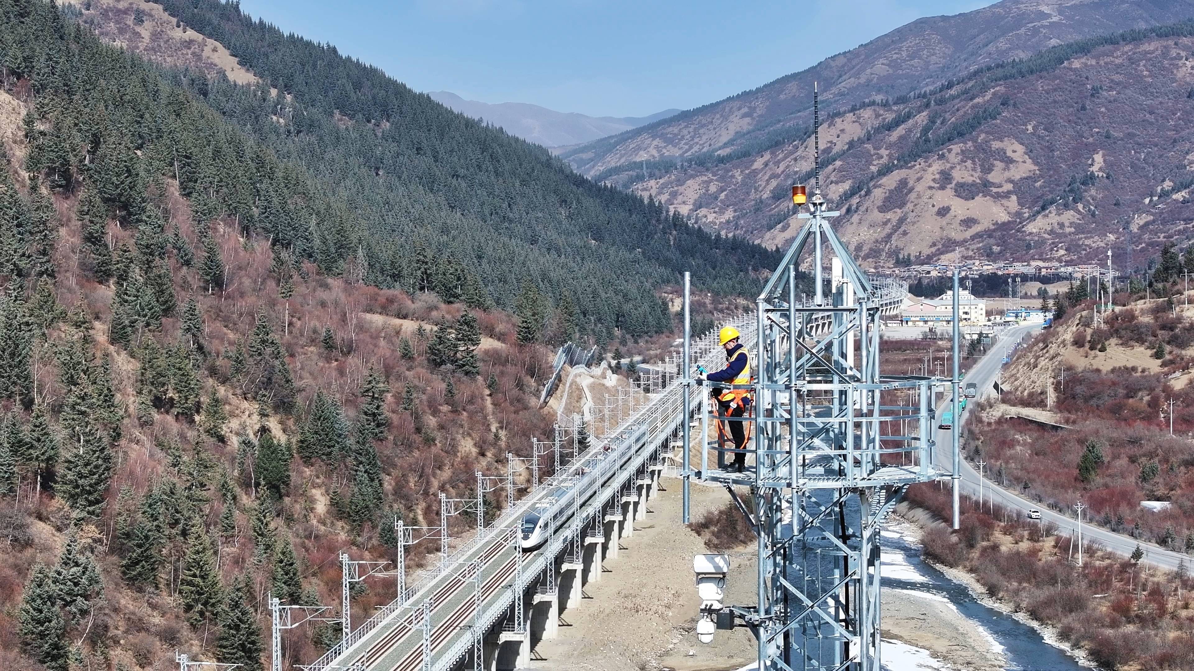 在川青铁路松潘段,宛小冬在铁路通信塔顶进行测试检修。新华社发(张能 摄)“说不冷是假的,尤其是刮风的时候,脸像被刀割一样。但每次检修完,听到对讲机里传来‘信号正常’的声音,就觉得一切都值得。”站在塔顶时,看着一趟趟顺利通过的列车,宛小冬脸上也露出了放松的笑容。